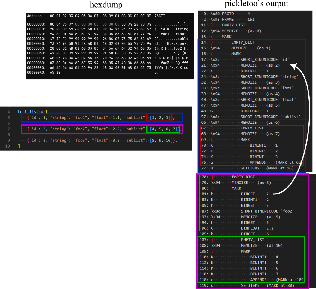 The image below disects the binary representations of the first and second elements in the list. The first element is actually pretty easy to read in the pickletools output (and even the hex dump) because the dict’s keys are spelled out in plain text. Essentially, the dict is “opened” with EMPTY_DICT (opcode is 0x7d or ‘}’ in ASCII), then keys and values are pushed onto the stack alternatingly, before SETITEMS collects all of the key-value pairs and puts them into the dict. The nested list works very similar, starting with EMPTY_LIST (ASCII ‘]’), then pushing each element before adding them all to the list with APPENDS.