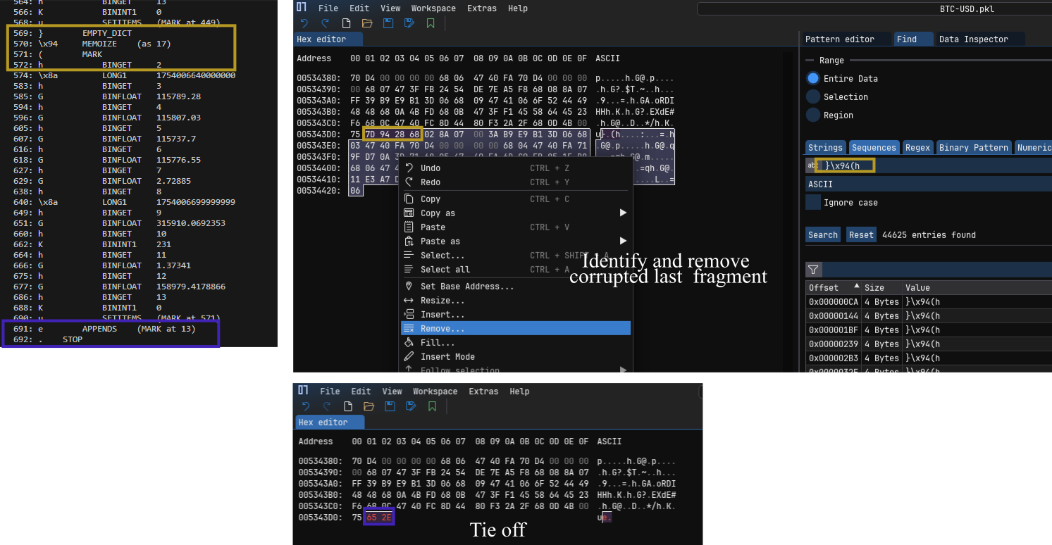 From understanding the pickle format, it’s also easy to understand how a corrupted file can be fixed. Obviously, if the file is truncated at a random position, the hierarchical object creation operations are cut off somewhere in the middle, leaving an invalid state. The goal is to find the last intact object in the binary, remove the broken rest behind it, and tie the file off correctly.
