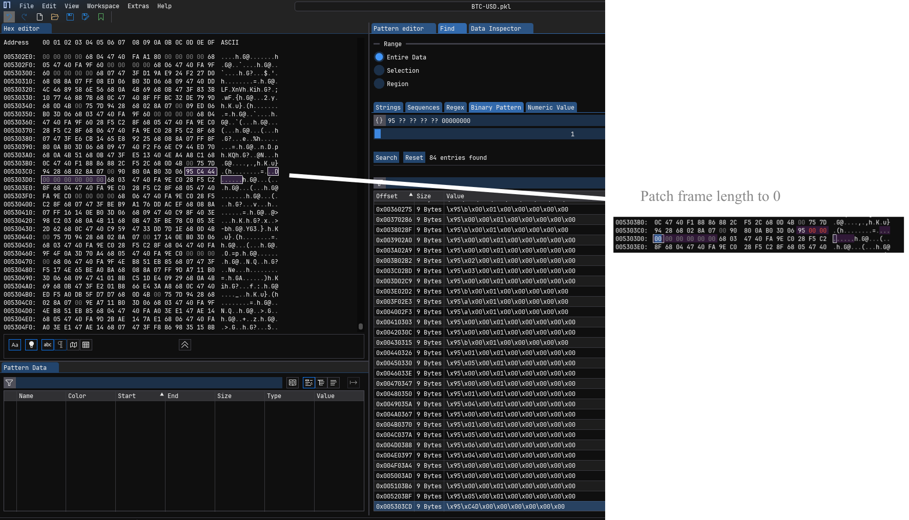 0x95 ?? ?? ?? ?? 00 00 00 00 assuming that the little endian frame length will never be larger than a 32 bit integer (actually it seems to be below 2^16 in the pickle implementations I’ve seen). Using a pattern like this will reduce the number of false positives compared to just searching for 0x95. I then patch the frame length of the last frame to 0 for simplicity, disabling prefetching for the last frame. Alternatively, you could figure out the correct new frame length and put it in, but this is error prone and not necessary, since the prefetching is only for performance reasons.